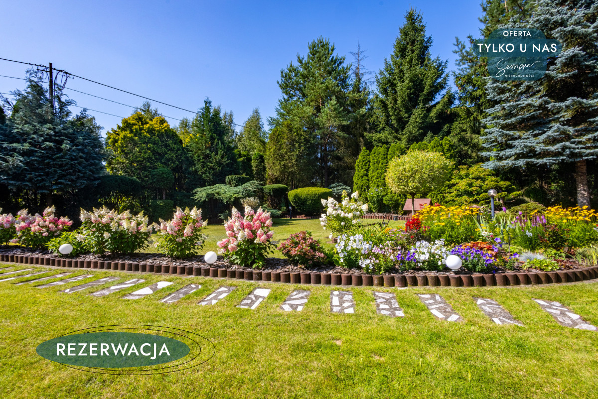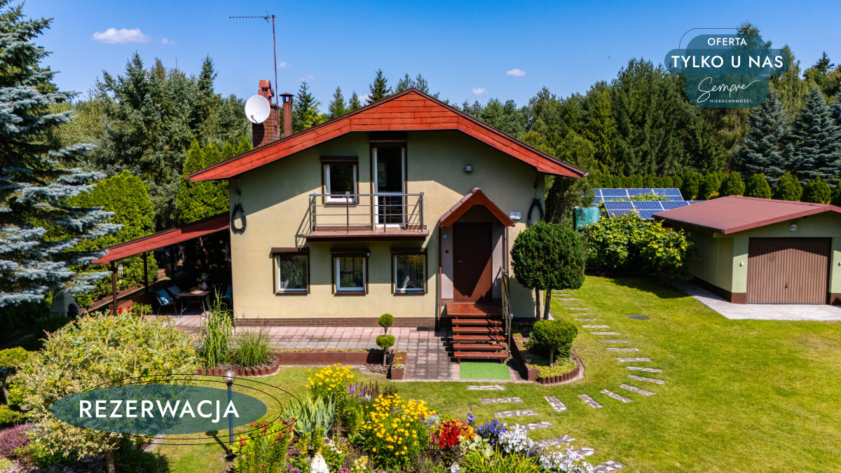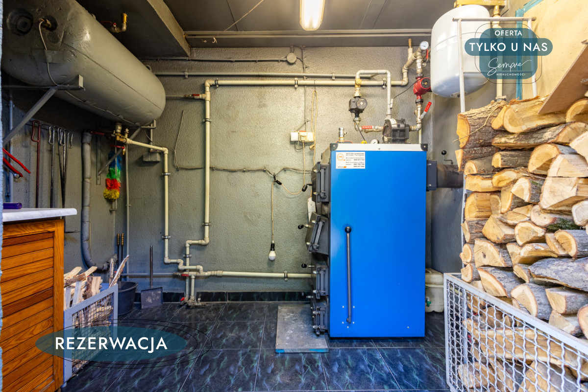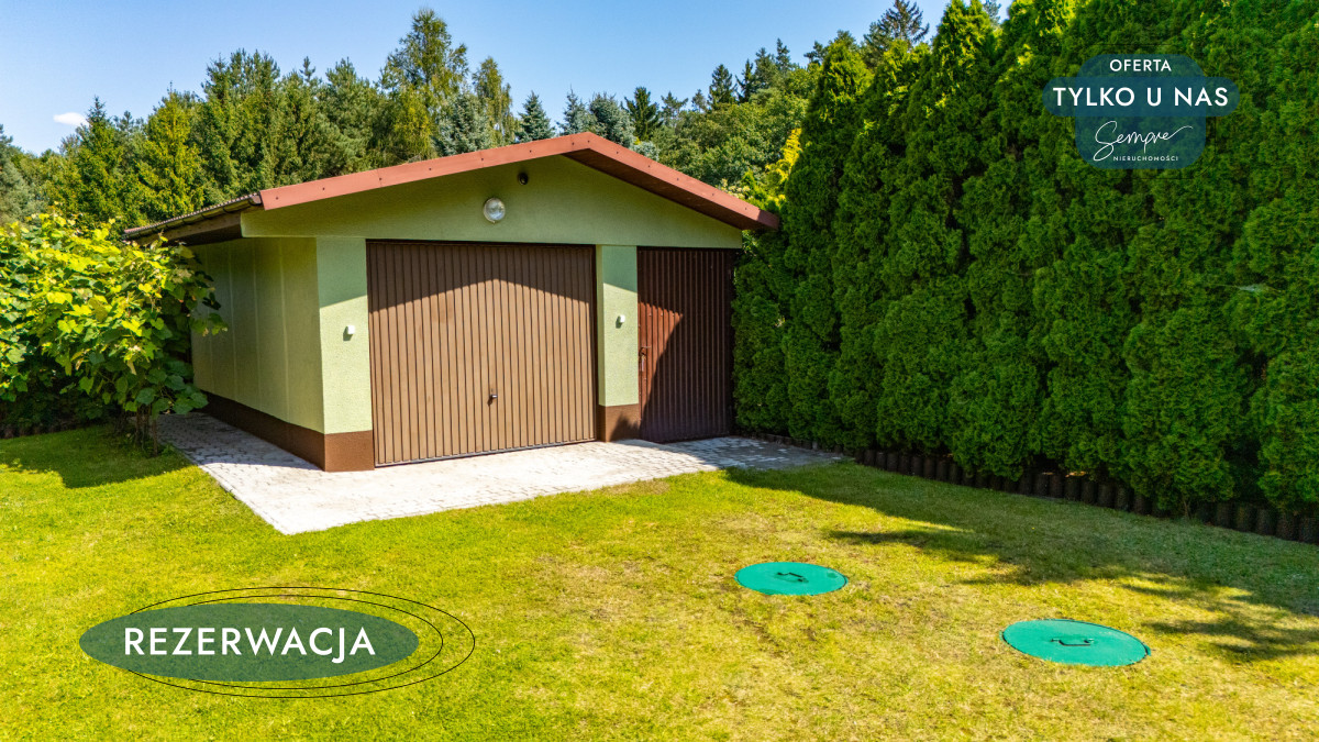 Działka jest w pełni ogrodzona, z bramą wjazdową i furtką. Wokół domu rozciąga się piękny, zadbany ogród oraz kilka krzewów owocowych, a praktyczne zaplecze gospodarcze obejmuje garaż z dodatkowym miejscem na rowery i sprzęt ogrodowy (o powierzchni 19 m²), wydzieloną przestrzeń na drewno i węgiel, a także pomieszczenia użytkowe, w tym kotłownię i pralnię z osobnym wejściem (ok.15,55 m²).