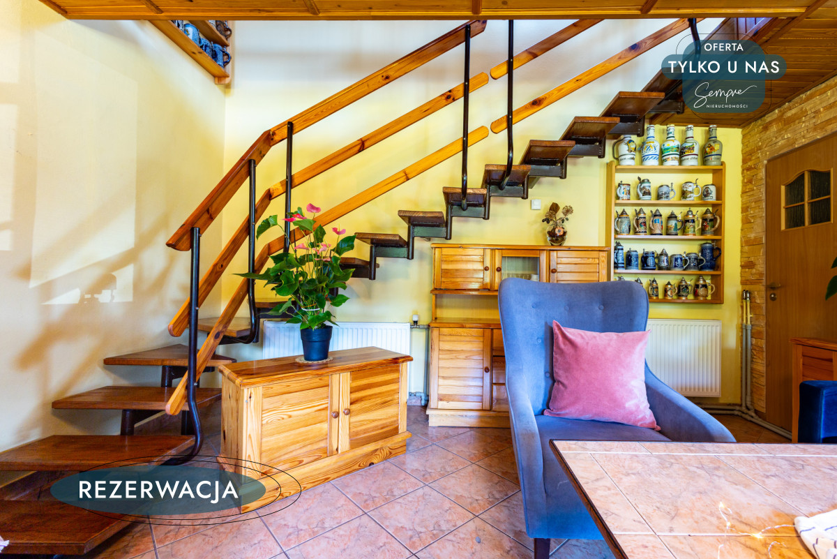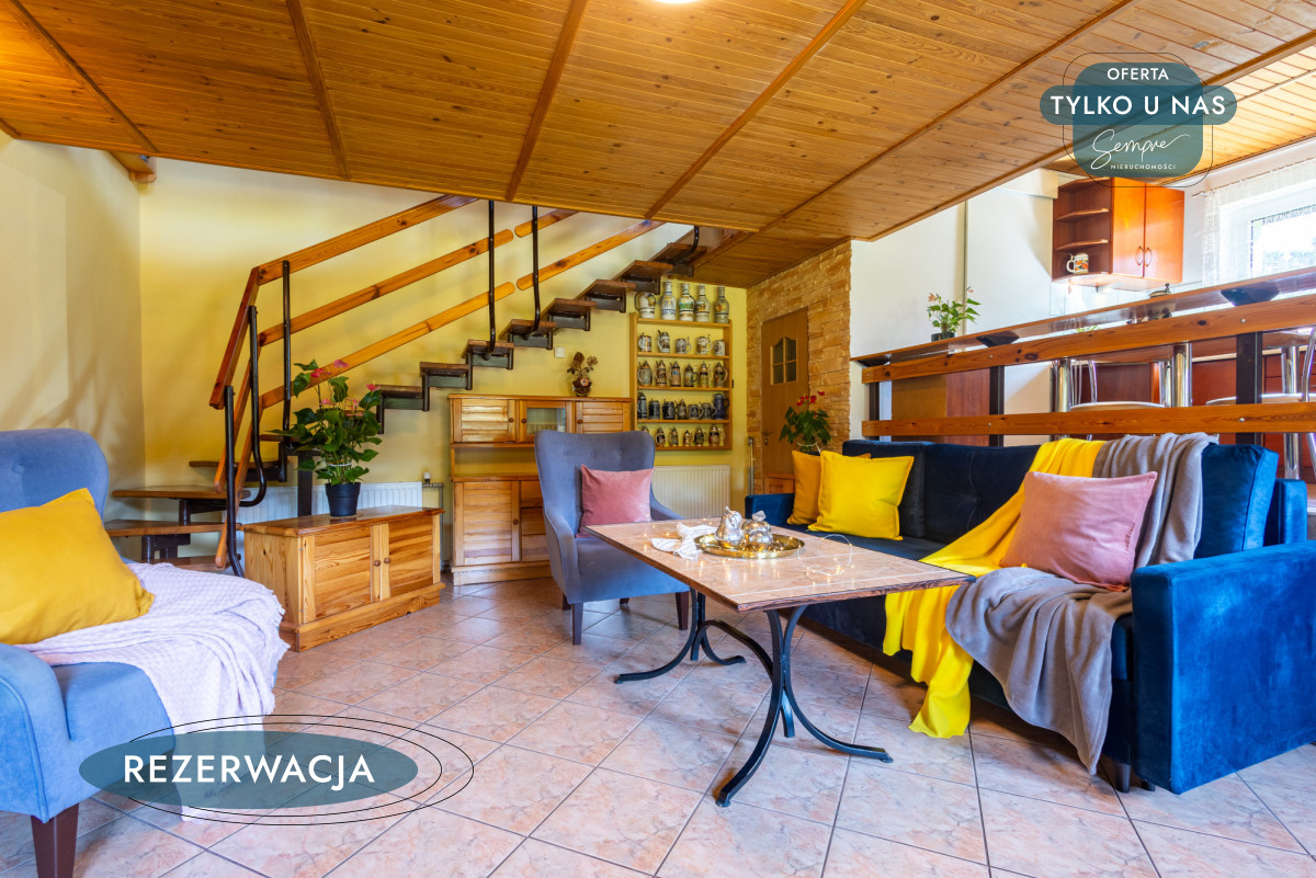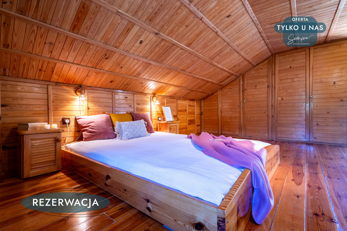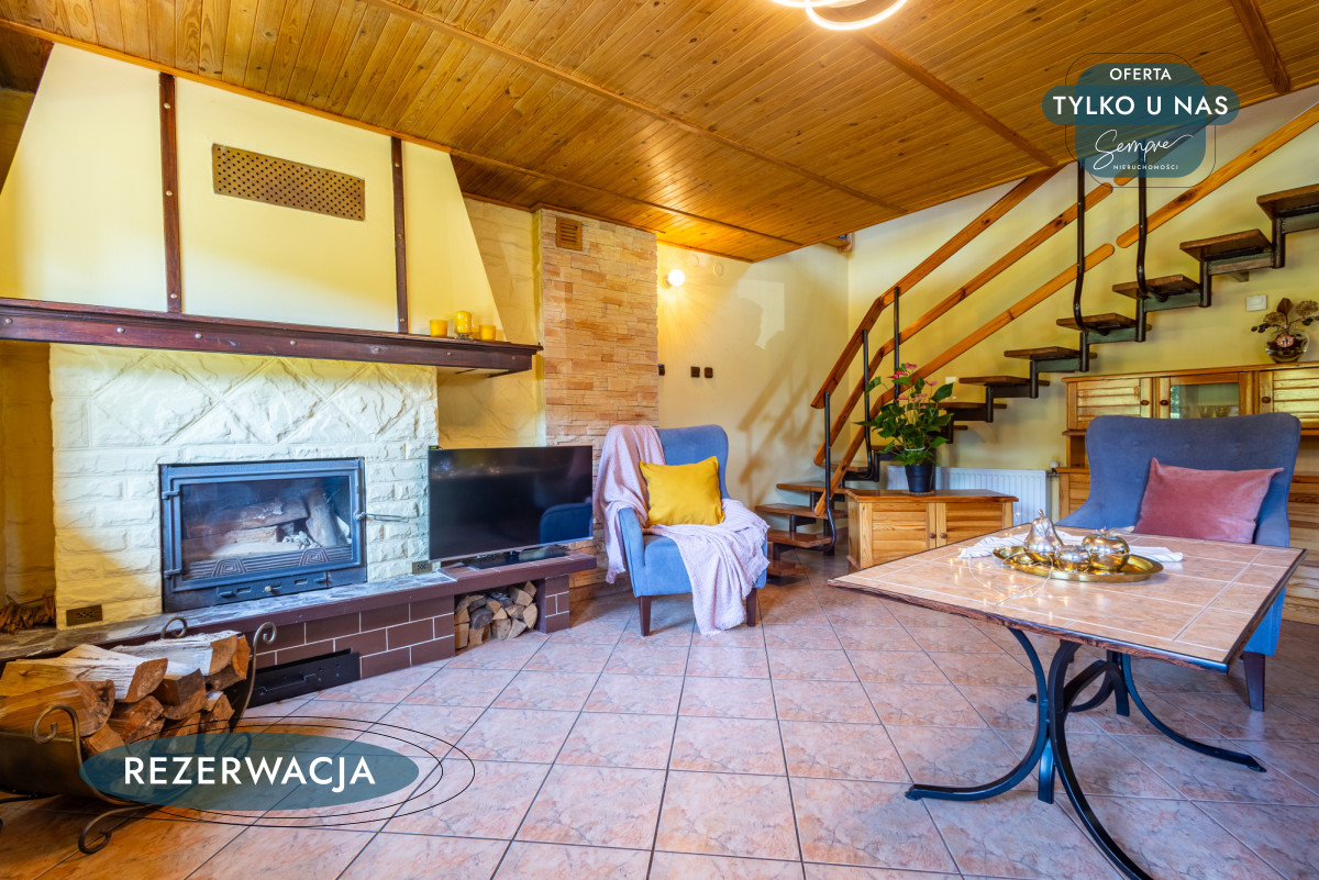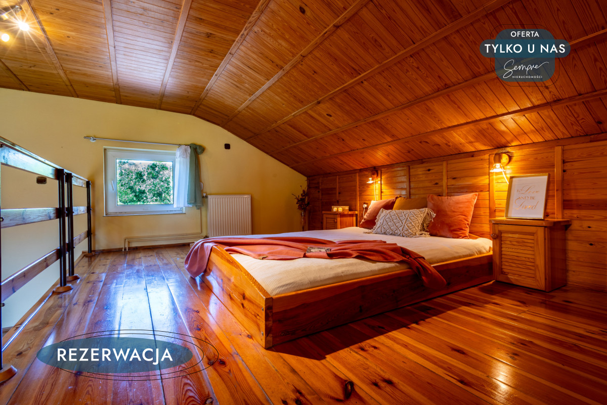 Powierzchnia domu to ok. 99,68 m² (42,09 m² powierzchni użytkowej na parterze, 38,59 m² pierwszej kondygnacji, 15,55 m² pomieszczenia gospodarcze). Wejście prowadzi bezpośrednio do jasnej kuchni w zabudowie, z widokiem na przestronny salon. Centralny punkt stanowi kominek, który nie tylko ogrzewa, ale i buduje przytulny, domowy klimat. Nowy zestaw wypoczynkowy zachęca do relaksu, a duże okna pozwalają obserwować zmieniające się pory roku. Drewniane schody prowadzą na piętro, gdzie mieści się duża sypialnia podzielona na dwie strefy – wypoczynkową, idealną na bibliotekę czy miejsce do pracy, oraz typowo sypialnianą, ciepłą i kameralną, z zabudowaną szafą.