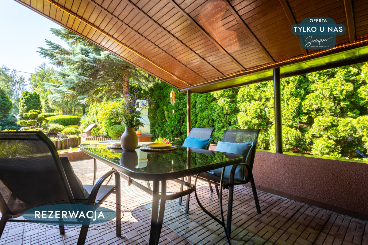Do domu przylega duży, zadaszony taras, który latem staje się sercem codziennego życia – idealnym miejscem na poranną kawę, popołudniowy odpoczynek czy wieczorne rozmowy przy grillu.
