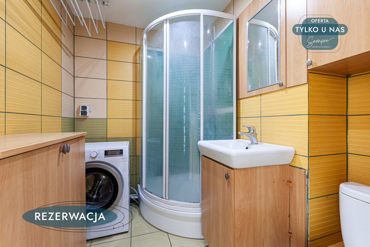 Łazienka jest wygodna i funkcjonalna – mieści zarówno pralkę, jak i dużą kabinę prysznicową.