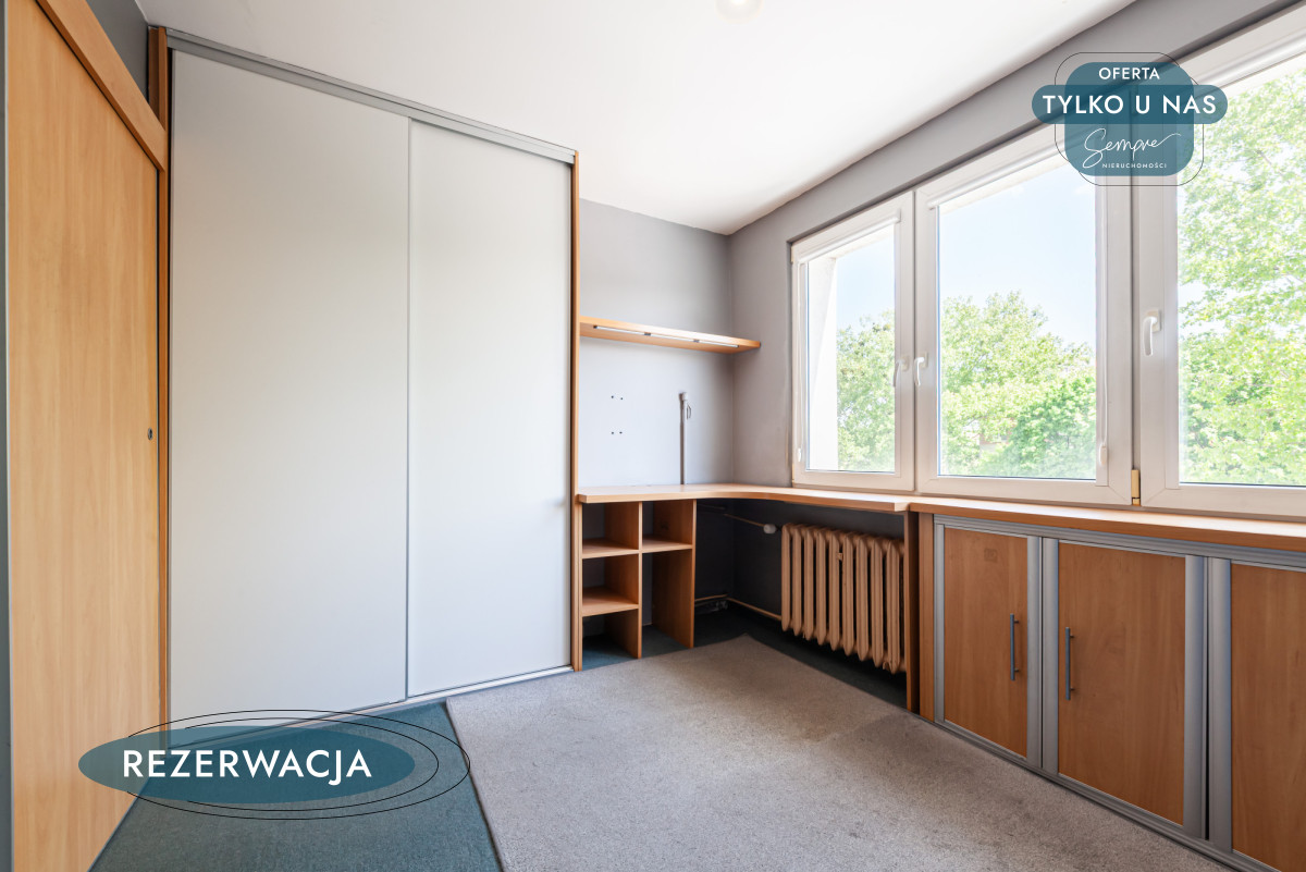 Po lewej stronie znajduje się otwarta kuchnia – dzięki częściowo usuniętej ścianie zyskała na przestronności i świetle. Po prawej – jasny, ustawny salon z wyjściem na balkon, z którego roztacza się widok na zieleń i szkołę. Drugi pokój to przytulna sypialnia z zabudową meblową i miejscem na duże łóżko lub pokój dziecięcy.