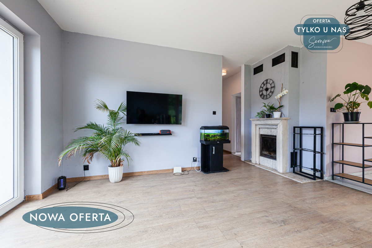 Dzięki dużym oknom tarasowym (trzyszybowe, firmy Salamander), wnętrze jest skąpane w naturalnym świetle, co dodaje energii i poprawia nastrój, eliminując poczucie ciasnoty czy ponurego wnętrza. Widok na zieleń za oknem zapewnia codzienną dawkę spokoju i bliskości z naturą, której tak często brakuje w miejskim zgiełku. Na jednej ze ścian przytulny kominek ogrzeje serca w chłodniejsze wieczory, tworząc romantyczną atmosferę.