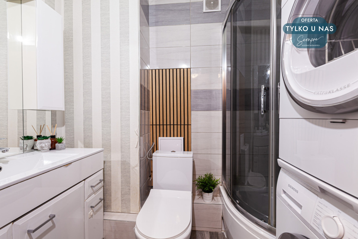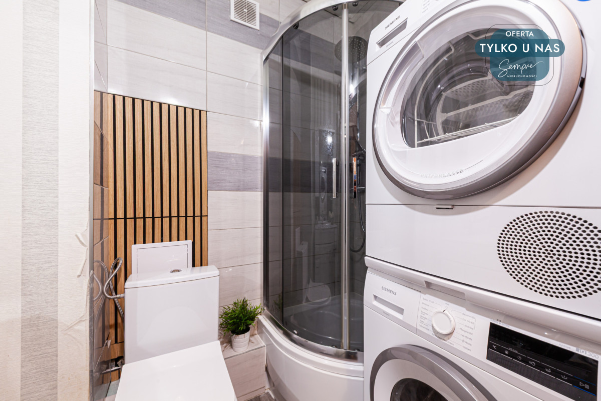 Nowoczesna i praktyczna – z kabiną prysznicową, WC, dużą umywalką oraz miejscem na pralkę.