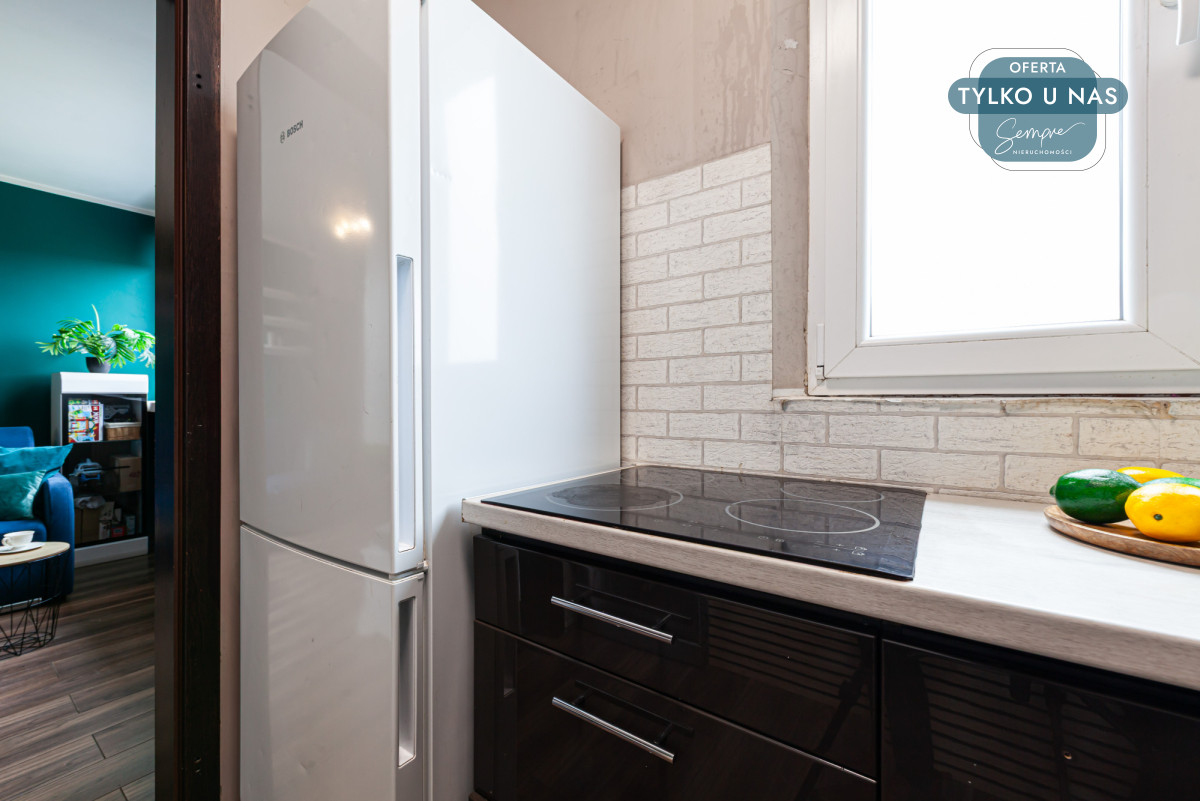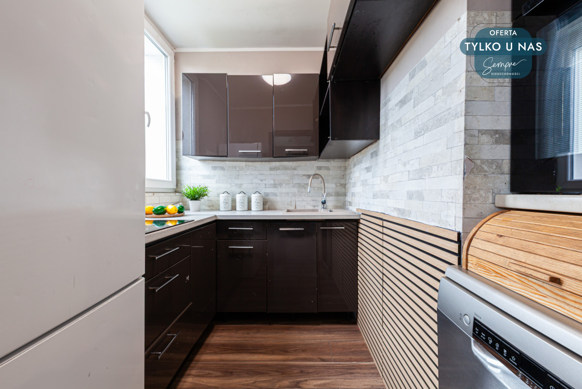 Funkcjonalna, utrzymana w ciepłej kolorystyce beżu i brązu. Wyposażona w meble oraz sprzęt AGD (lodówka, piekarnik, płyta indukcyjna), które pozostają do dyspozycji nowego właściciela.