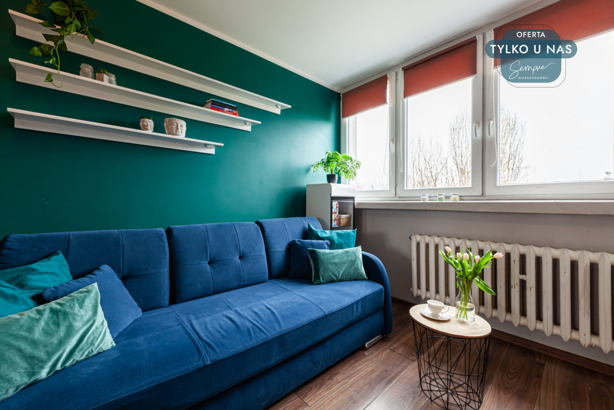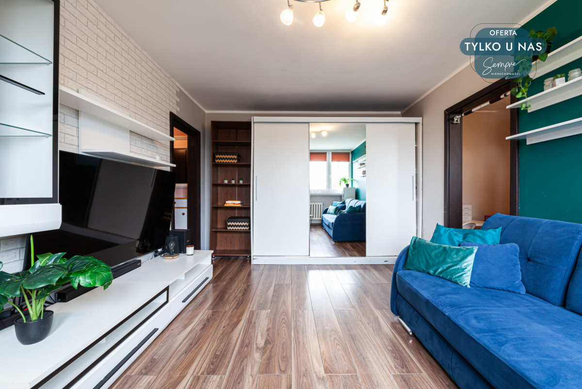 Przestronny i ustawny, z panelami na podłodze. W cenie pozostaje stylowa sofa, pojemna szafa oraz szafka RTV.