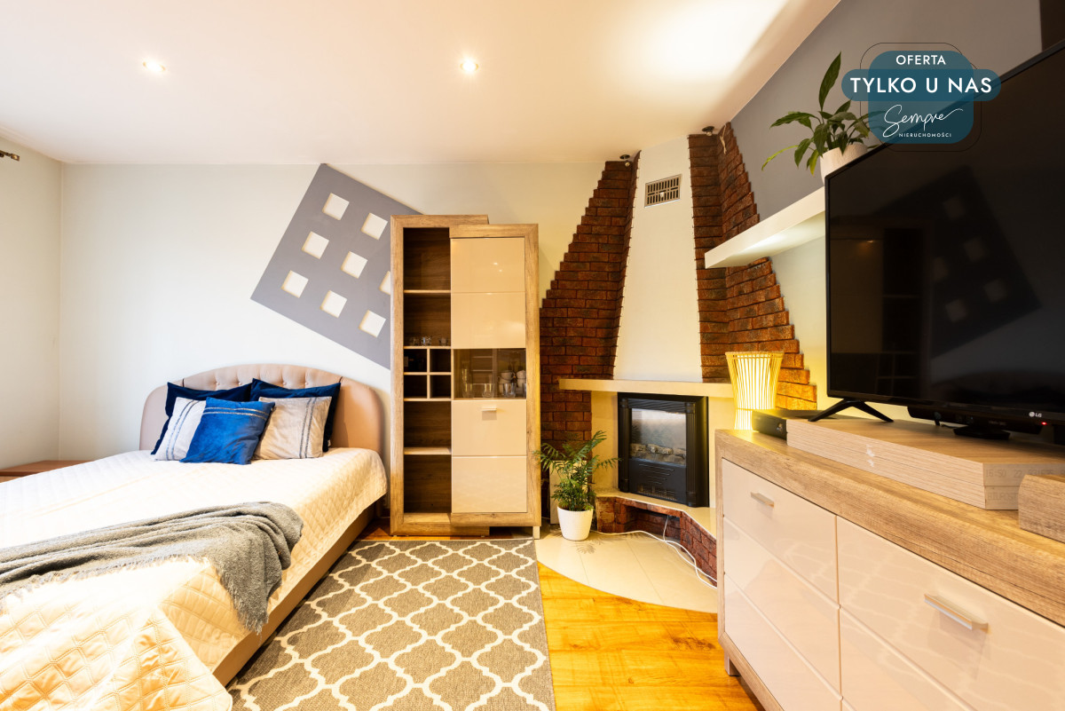 Dodatkowo znajdziemy tu pokój dziecięcy z biurkiem i łóżkiem na podwyższeniu oraz sypialnię rodziców z klimatycznym kominkiem i dużą szafą.