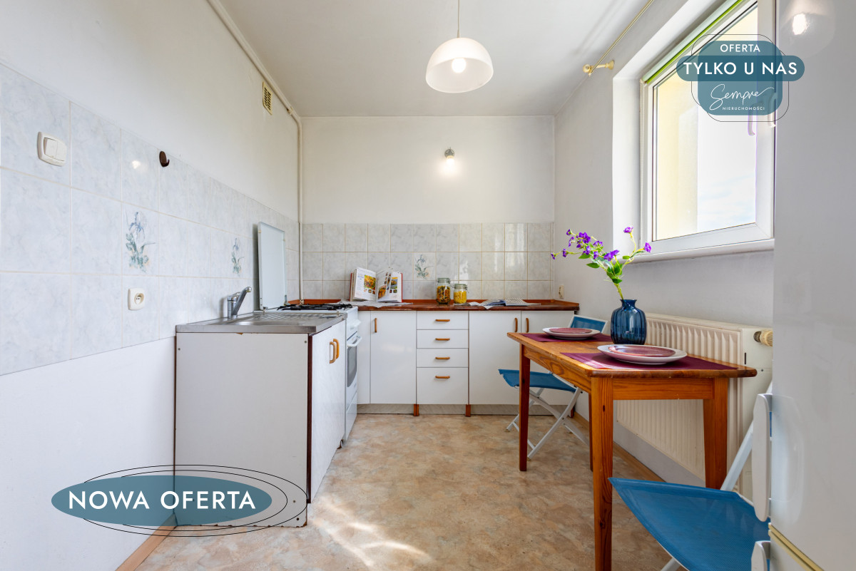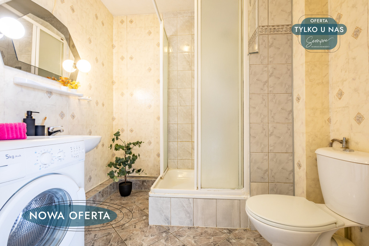 Mieszkanie sprzedawane jest z umeblowaniem i pełnym AGD: lodówka, piekarnik, kuchenka, zmywarka, pralka, co umożliwia natychmiastowe zamieszkanie lub szybkie wystawienie na wynajem. Łazienka wyposażona w kabinę prysznicową; stan techniczny określony jako do odświeżenia — typowe prace kosmetyczne wystarczą, by nadać wnętrzu nowy charakter.