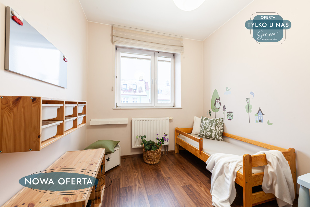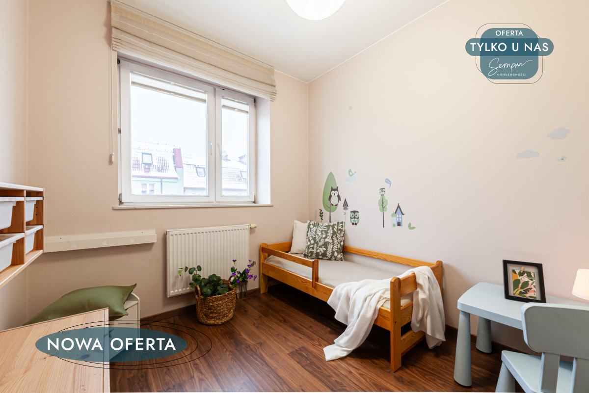 Drugi pokój (ok. 11,6 m²), obecnie pełniący funkcję pokoju dziecięcego, daje dużą elastyczność aranżacyjną — z powodzeniem może stać się gabinetem, pokojem młodzieżowym lub dodatkową sypialnią.
