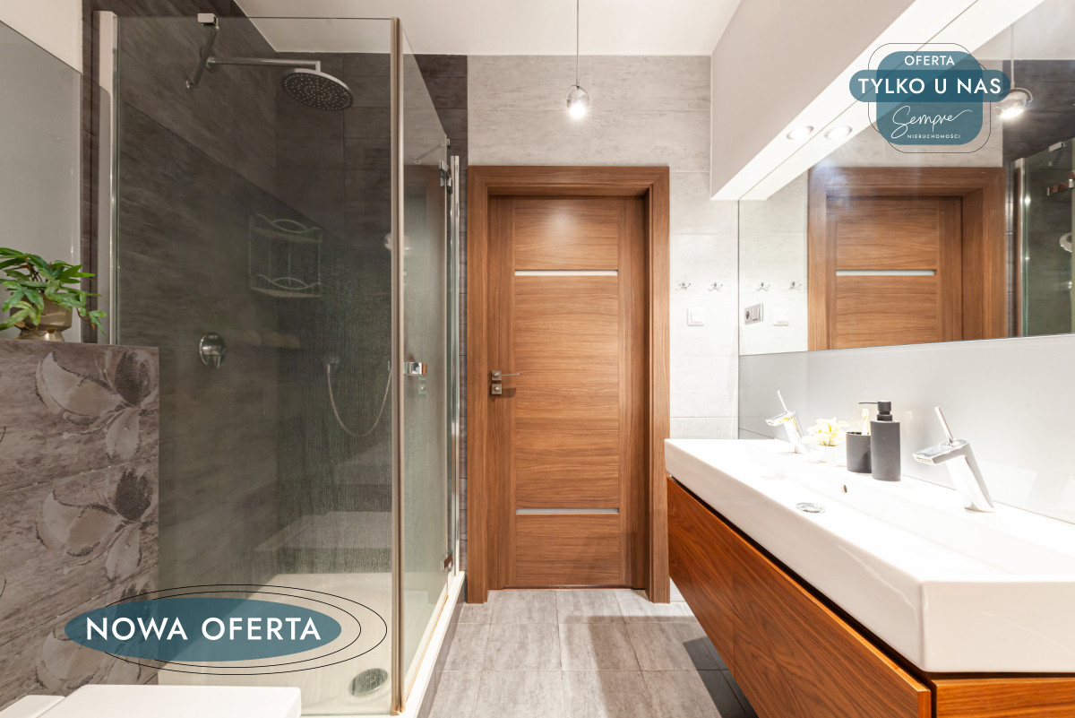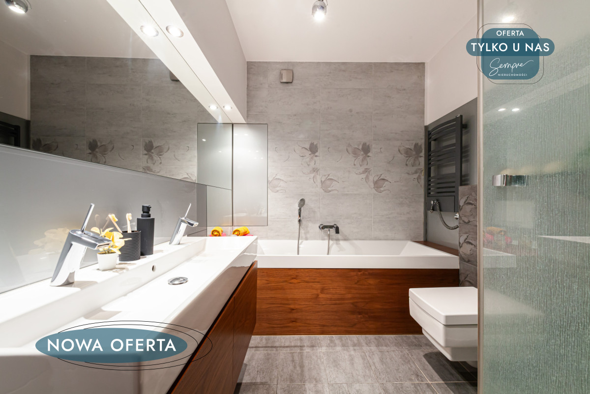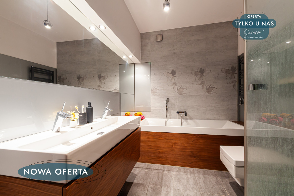Na szczególną uwagę zasługuje łazienka, zaprojektowana z myślą o codziennym komforcie: podwójna umywalka, wanna oraz prysznic w jednym pomieszczeniu to rozwiązanie rzadkie, a niezwykle praktyczne — zwłaszcza przy porannym pośpiechu.