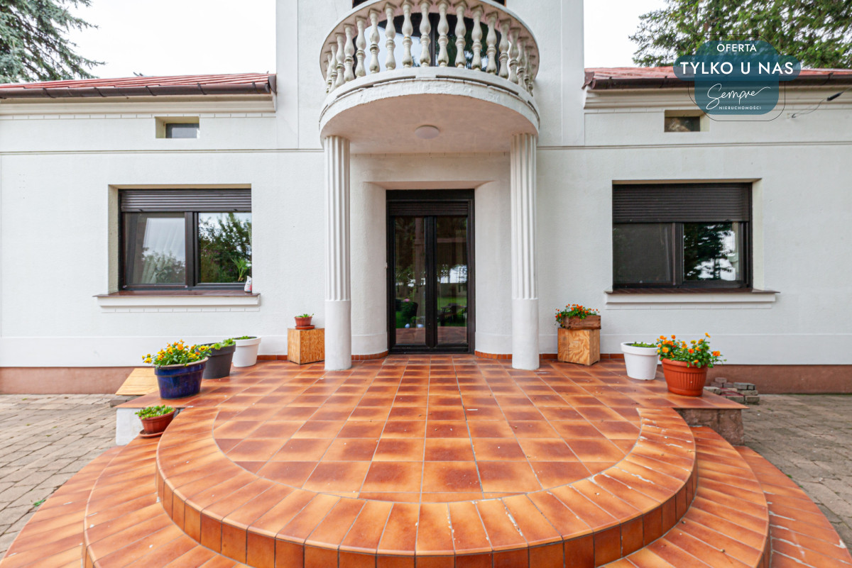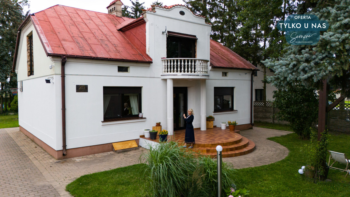 Dom zachwyca szerokim frontem, centralnie usytuowanym wejściem oraz półokrągłym balkonem wspartym na ozdobnych kolumnach.
