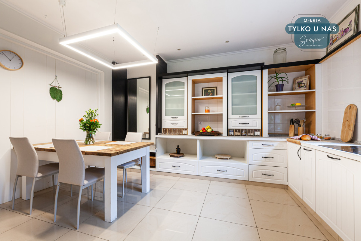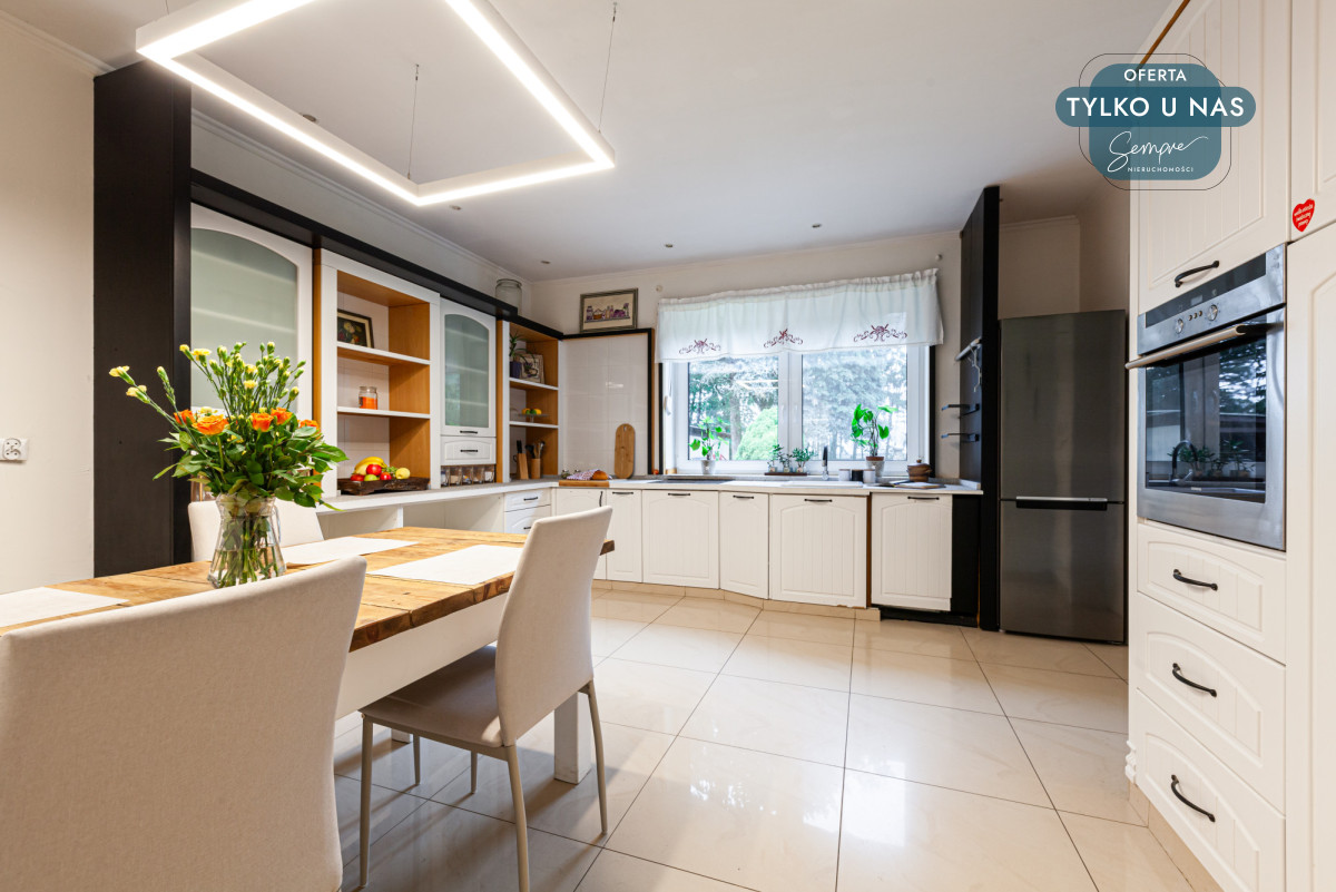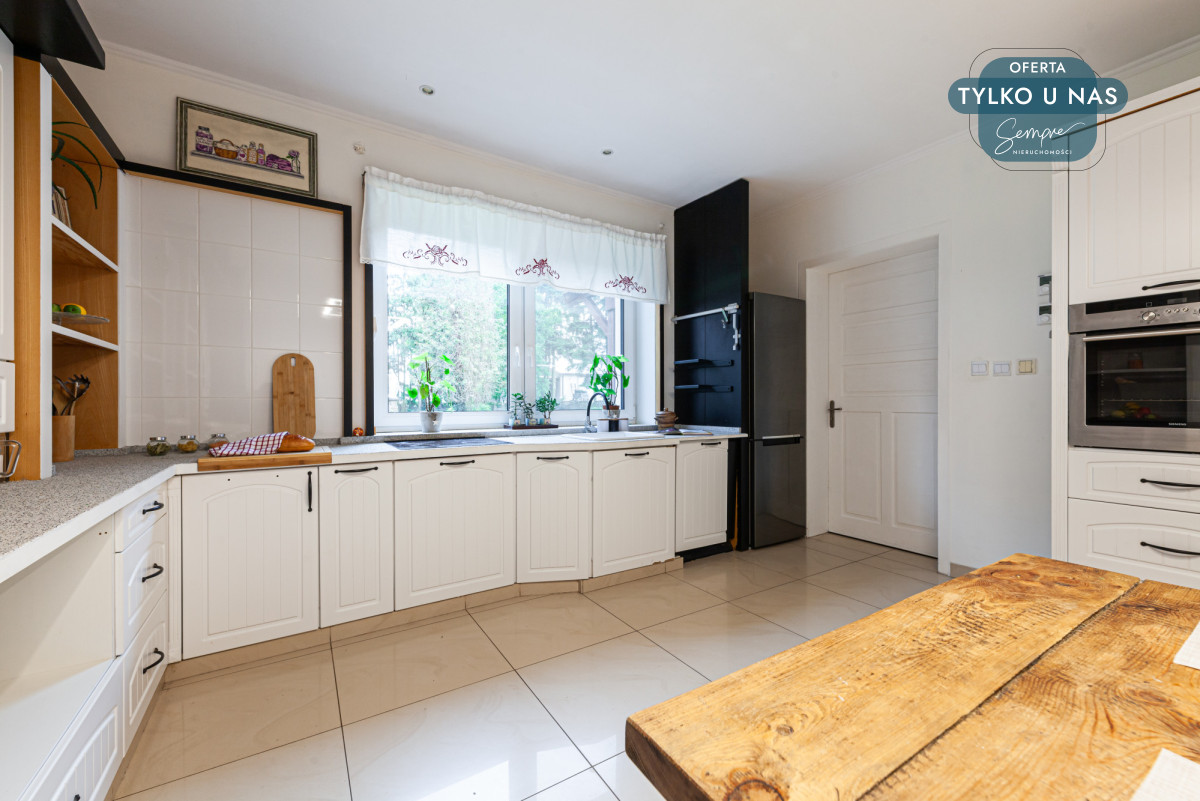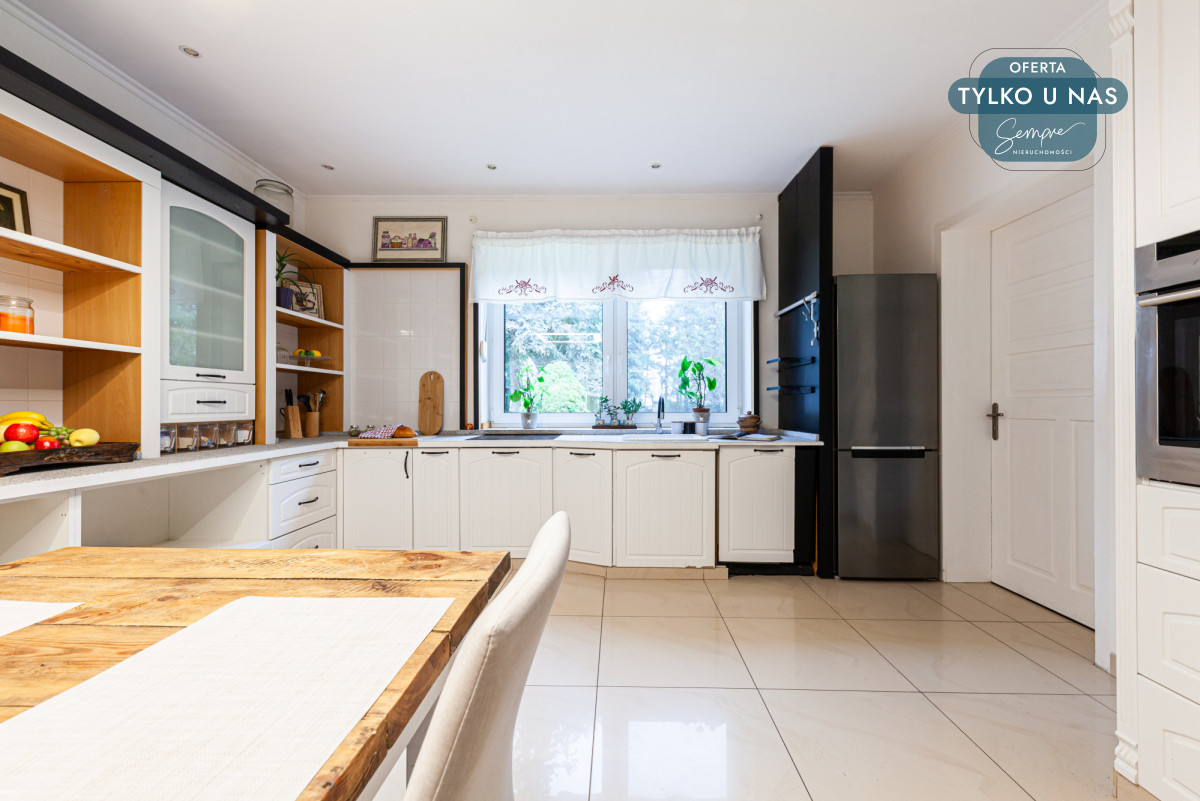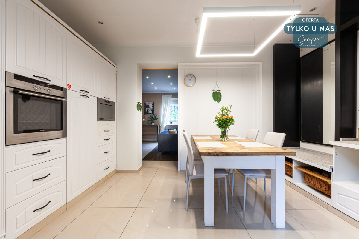 Przedsionek prowadzi do dużej, stylowej kuchni (18,40 mkw), która jest sercem tej posiadłości. Białe szafki rozjaśniają wnętrze, a duże okno oferuje widok na przepiękny ogród. Centralnie umieszczony duży stół idealnie nadaje się na rodzinne posiłki. Jest wyposażona w cały sprzęt AGD.