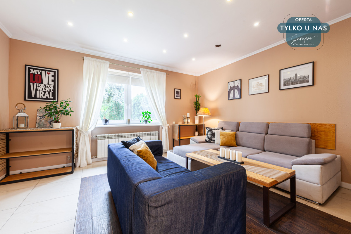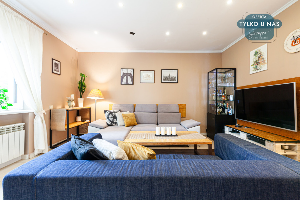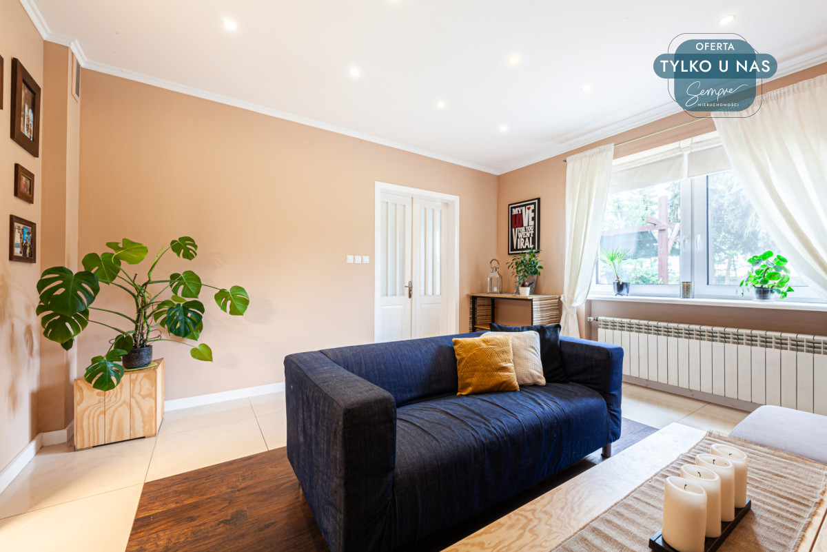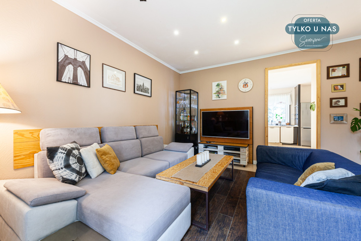 Z kuchni przechodzimy do przytulnego salonu (19,50 mkw), z którego okno wychodzi na przednią część ogrodu. Znajdują się tutaj dwie wygodne kanapy, stolik kawowy i duży telewizor.