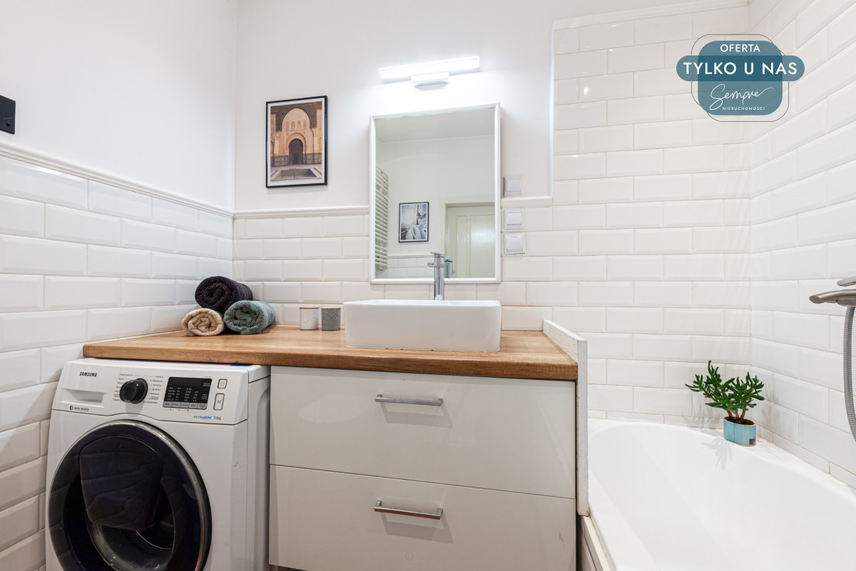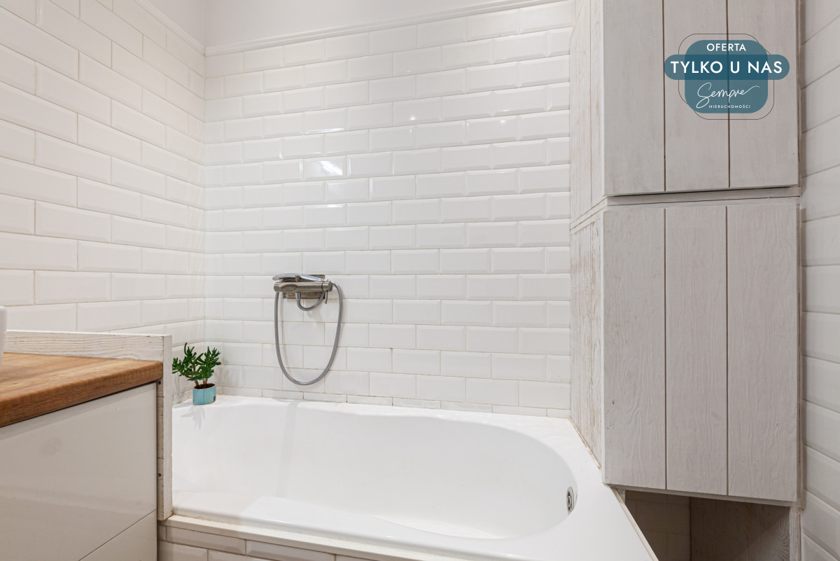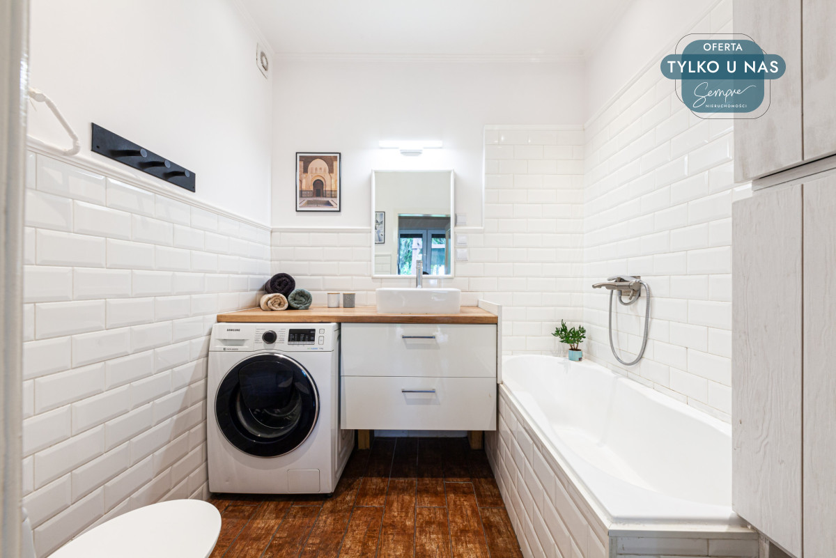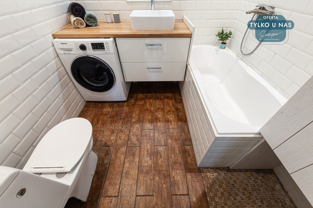 Elegancka łazienka (4,50 mkw) w białych kolorach z drewnianymi elementami oferuje relaks w wannie po długim dniu.