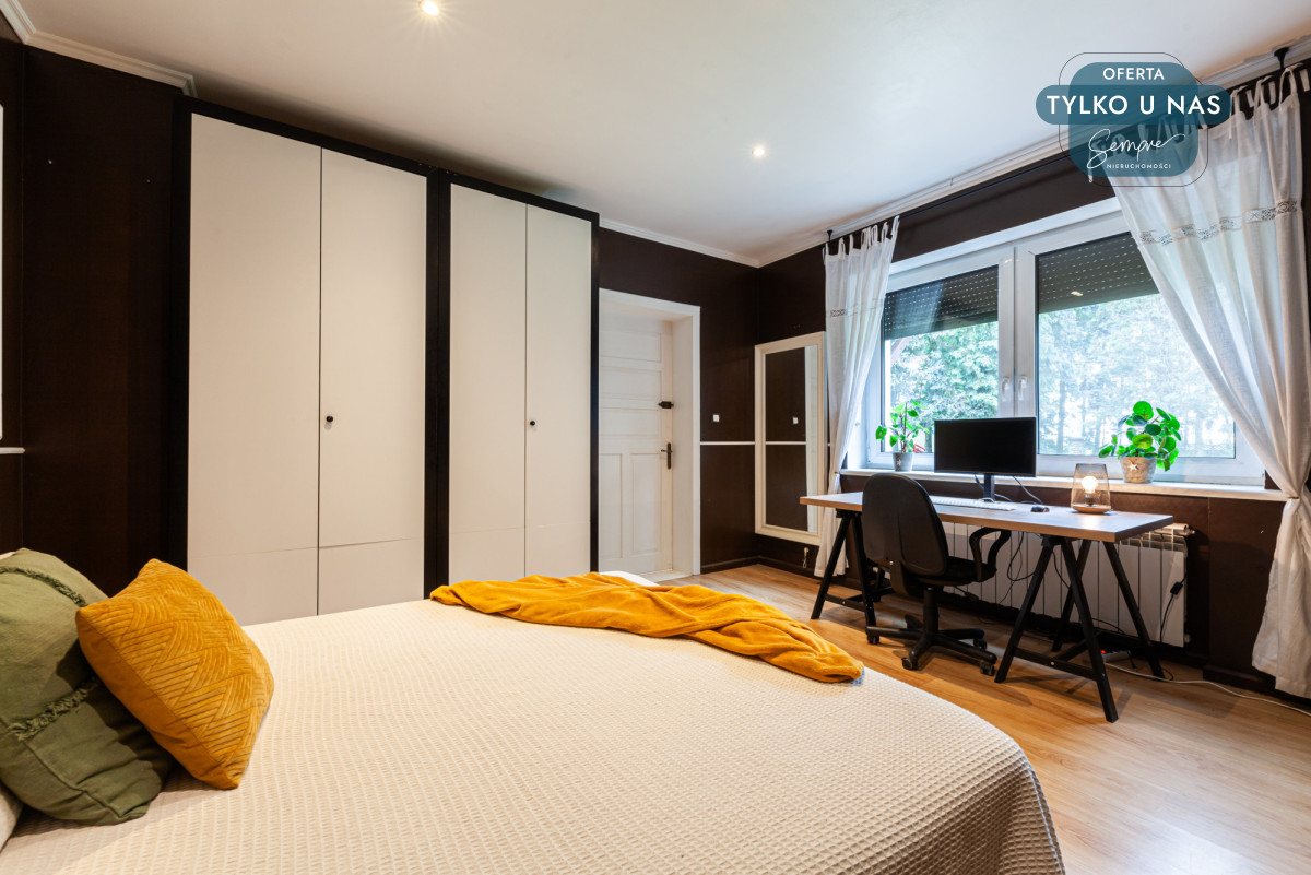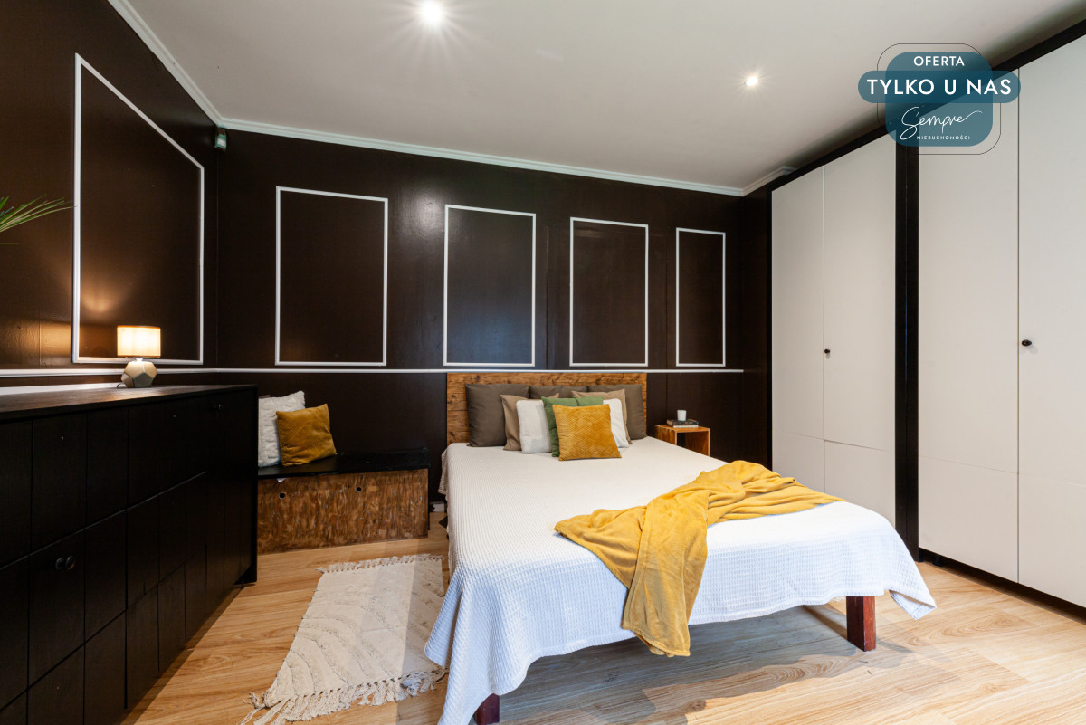 Na lewo od wejścia mieści się piękna, klimatyczna sypialnia (17,30 mkw) z dużym łóżkiem i oknem z widokiem na uspokajającą zieleń.