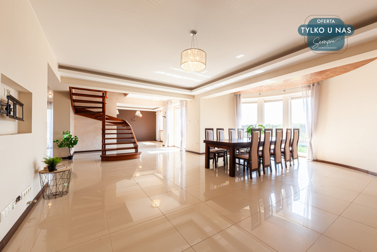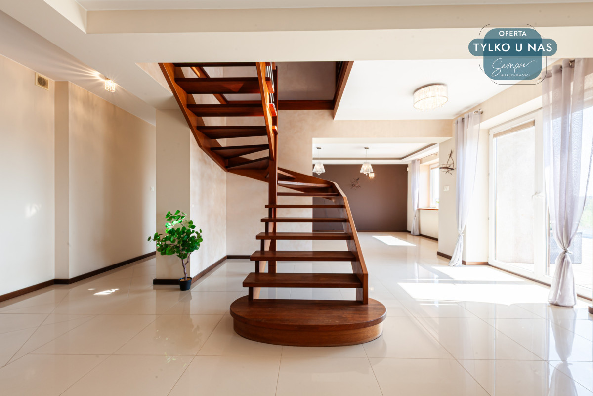 Od wejścia z korytarza widzimy ekskluzywny salon połączony z jadalnią. Zachwyca imponującą przestrzenią, gdzie promienie słońca swobodnie wpadają przez duże dwuszybowe okna plastikowe i drzwi tarasowe. Z tarasu widzimy rozległą zieloną przestrzeń łąk. W centrum salonu przepiękne schody z ciemnego drewna merbau o otwartej konstrukcji dodają wnętrzu lekkości i charakteru.