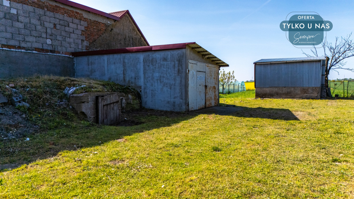 Oprócz domu na terenie nieruchomości znajduje się również wybetonowana ziemianka, stanowiąca praktyczny schowek lub miejsce przechowywania. Znajdziemy tam również dwa garaże, w tym jeden wysoki, doskonały do przechowywania większych pojazdów lub sprzętu.