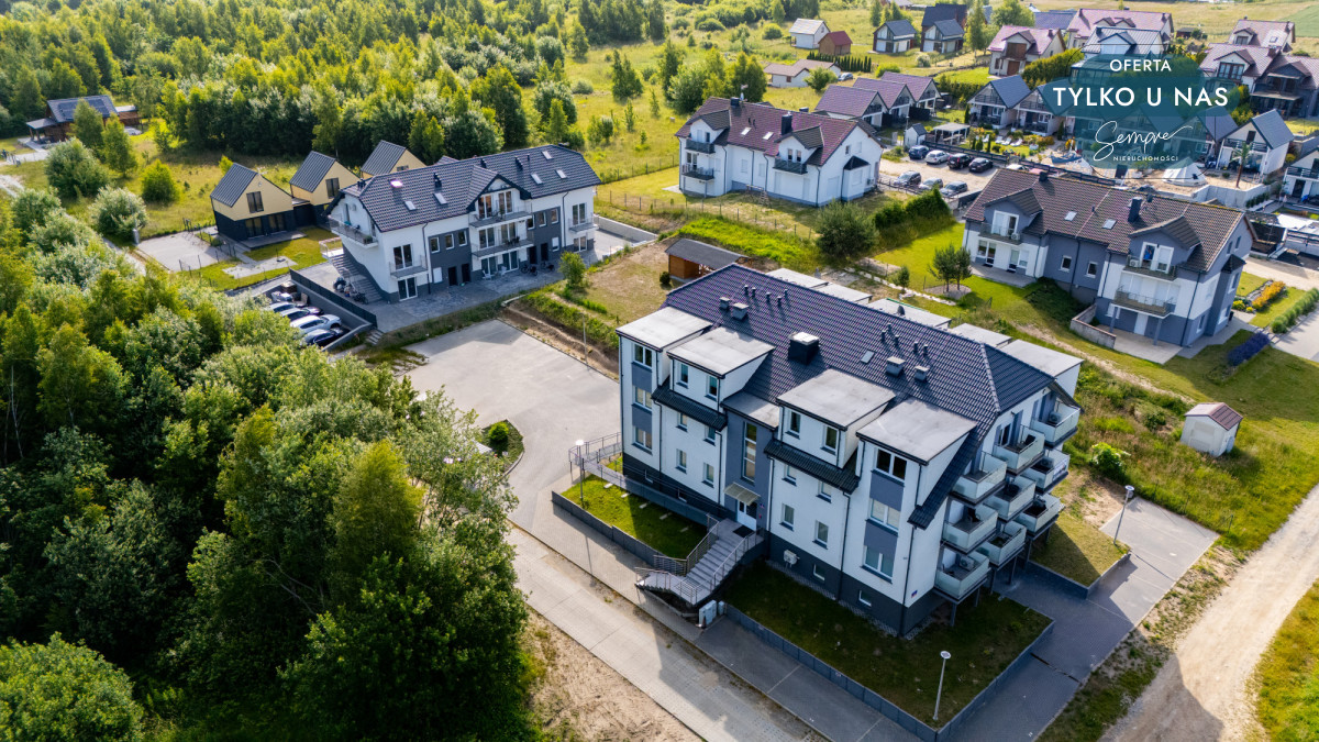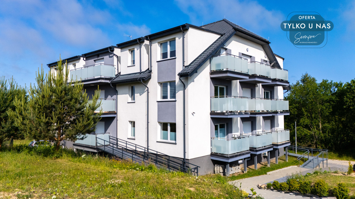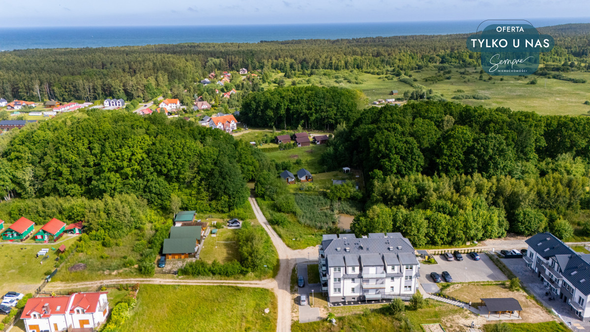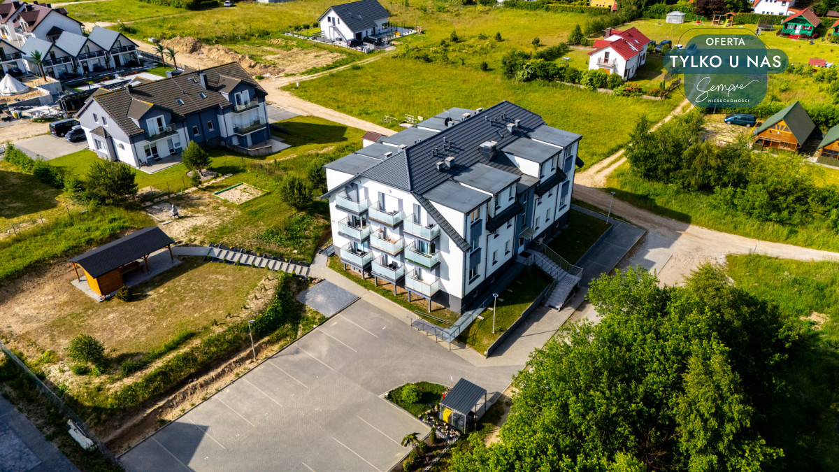 Apartament znajduje się w kameralnym, dwupiętrowym budynku, na 1. piętrze, w cichej i spokojnej okolicy – z dala od wakacyjnego zgiełku, a jednocześnie blisko wszystkich atrakcji nadmorskich. Teren wokół budynku jest zadbany, a każdy lokal posiada przypisane miejsce parkingowe, co znacząco podnosi komfort codziennego użytkowania i wypoczynku.
