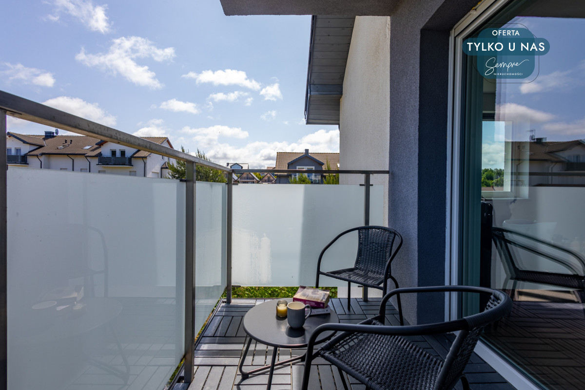 Balkon z wyjściem z salonu – idealny do porannej kawy lub relaksu przy zachodzie słońca.