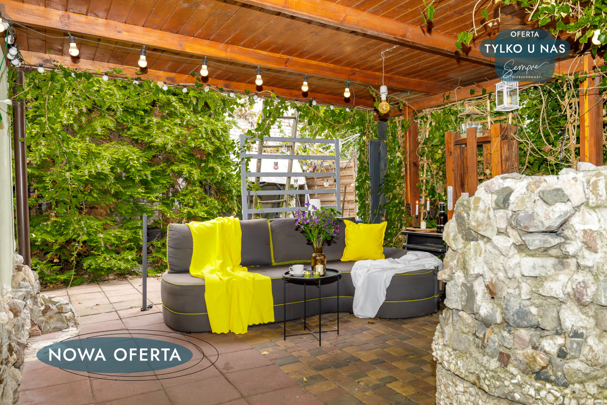 Nieruchomość o powierzchni zabudowy 63 m² składa się z trzech ustawnych pokoi, kuchni, łazienki oraz przytulnego, zadaszonego tarasu z kominkiem, który doskonale sprawdzi się zarówno na spotkania z rodziną, jak i relaks przy kawie. Całość uzupełnia zielony ogródek, idealny do wypoczynku.