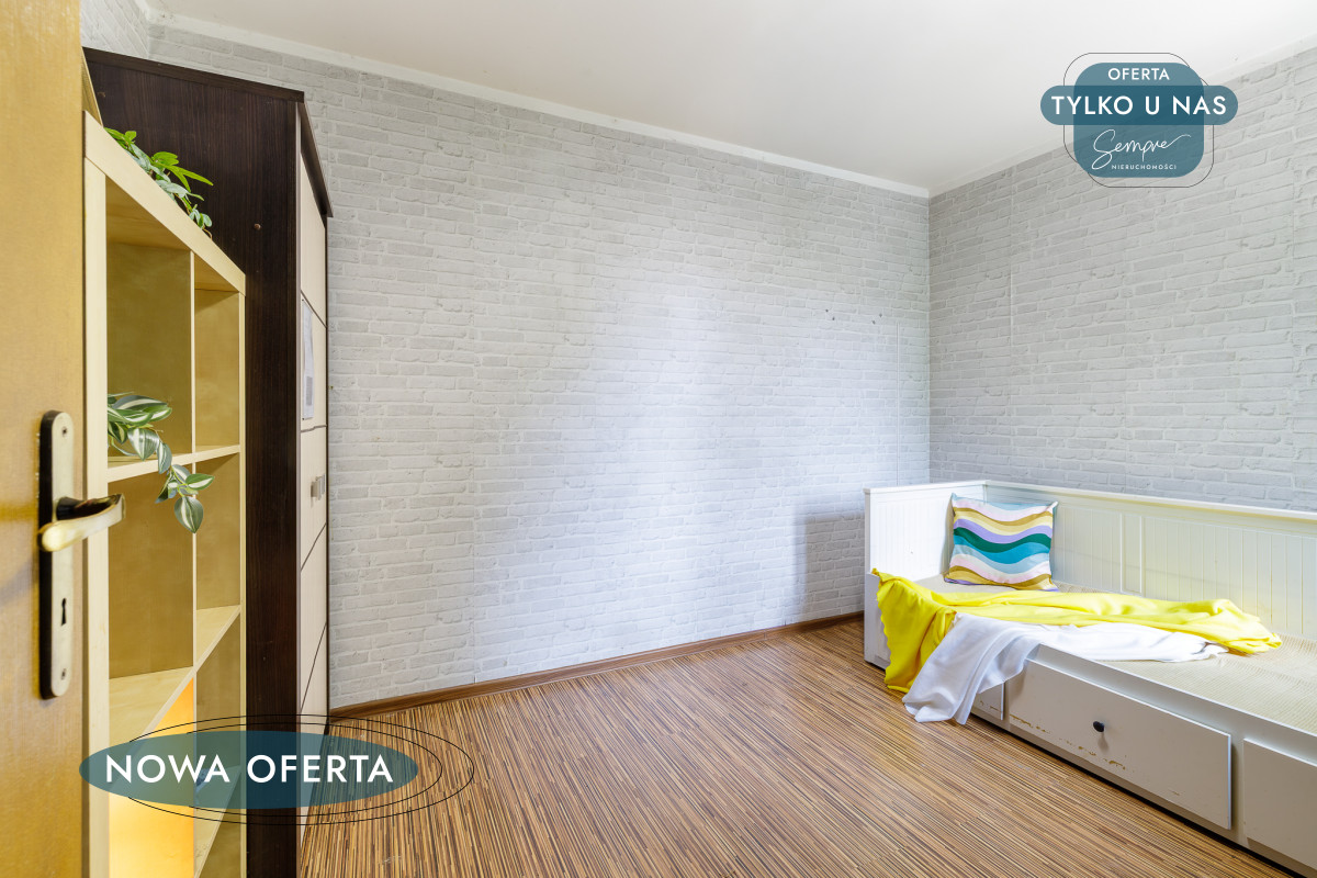 Salon jest duży i ustawny, w kształcie kwadratu. Z łatwością zmieści wygodną narożną kanapę oraz stół, przy którym cała rodzina może spędzać wspólne chwile. Tuż obok znajduje się przytulna sypialnia – zaciszne miejsce sprzyjające odpoczynkowi.