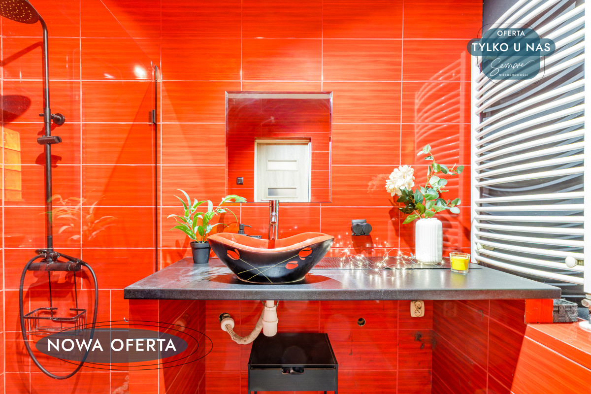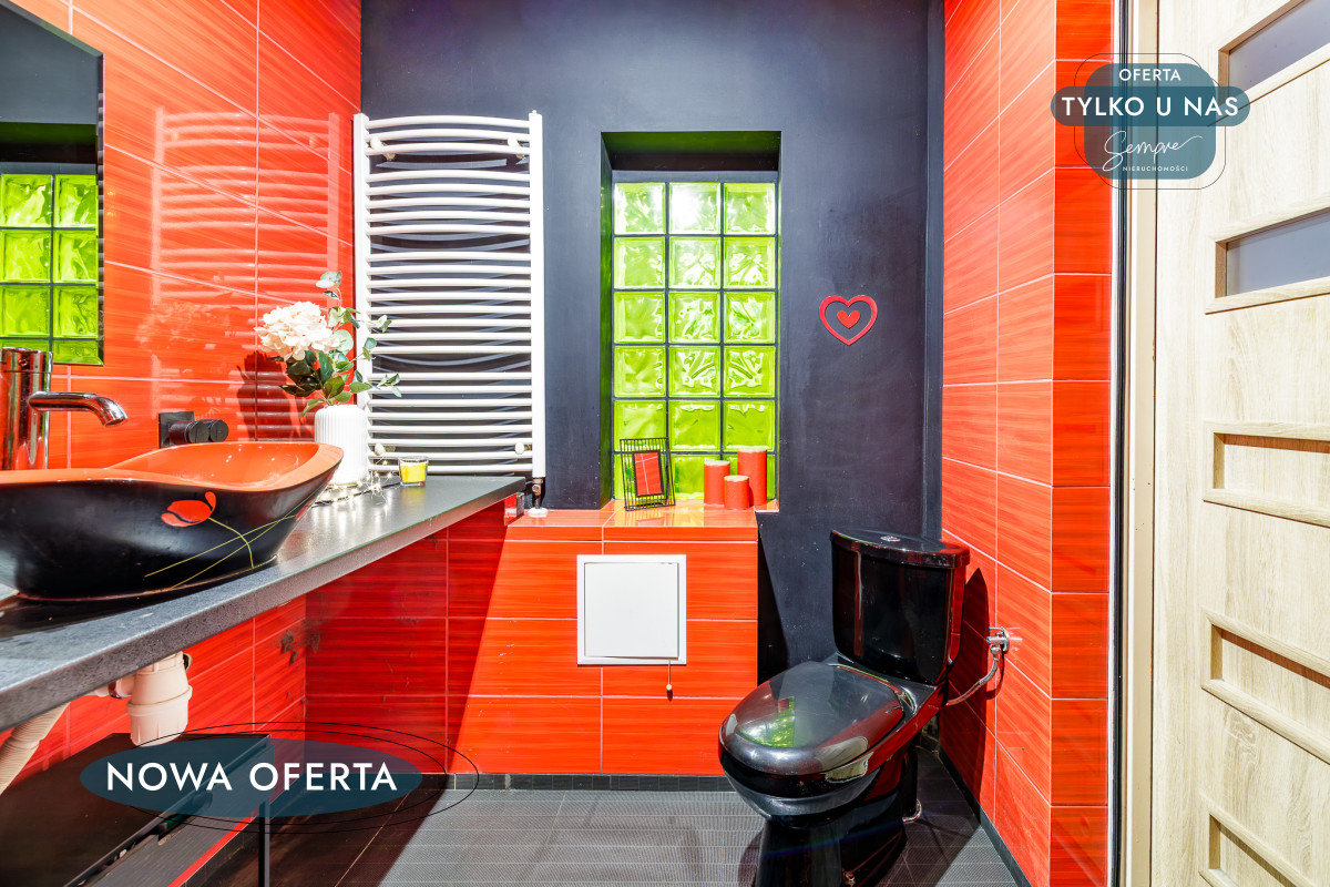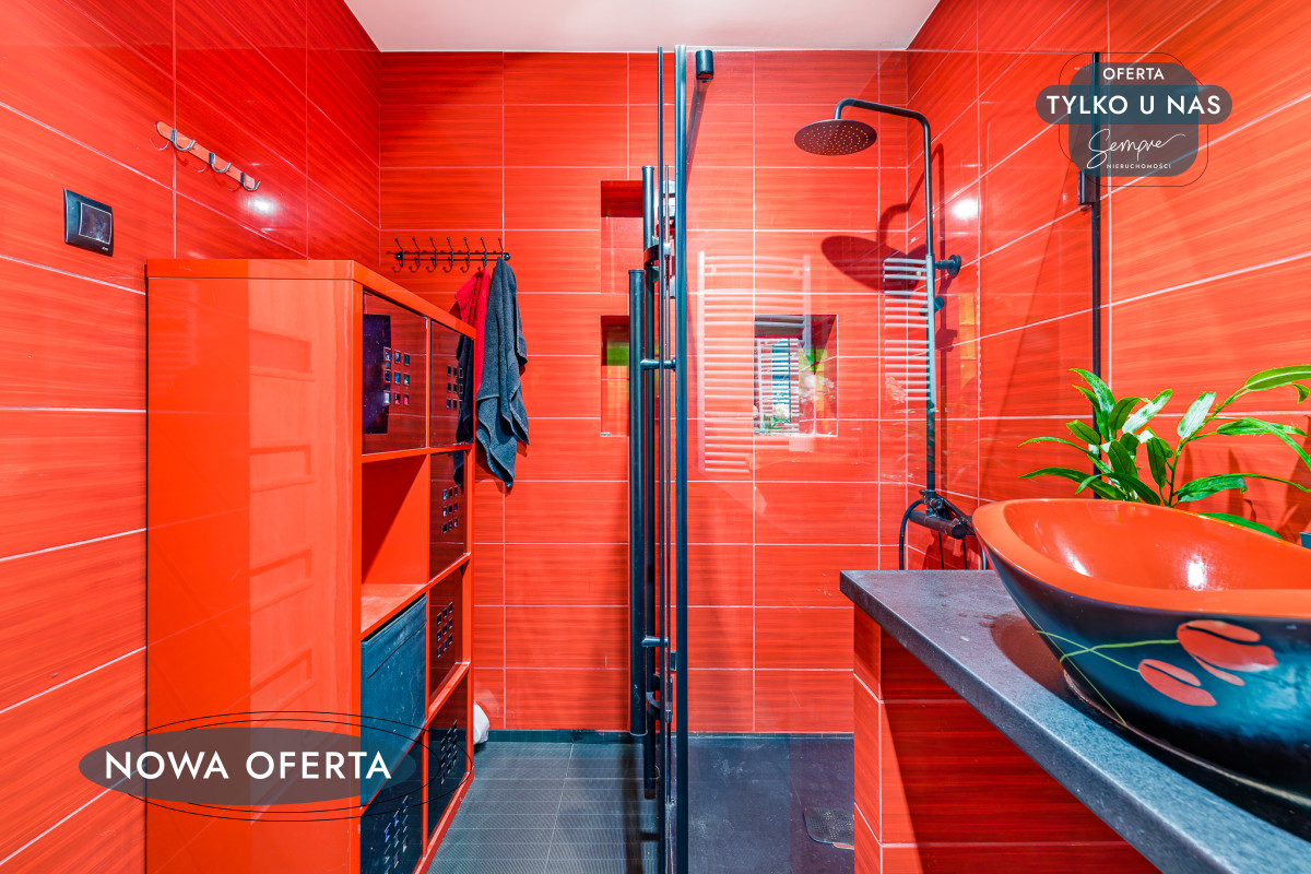 Łazienka w odważnych, romantycznych czerwieniach zachwyca charakterem. Wyposażona została w prysznic, elegancką umywalkę, WC oraz praktyczne szafki do przechowywania. To pomieszczenie z pewnością podkreśla unikatowy styl całego domu.