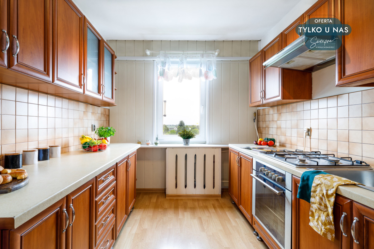 – Oddzielna i w pełni wyposażona kuchnia z oknem.