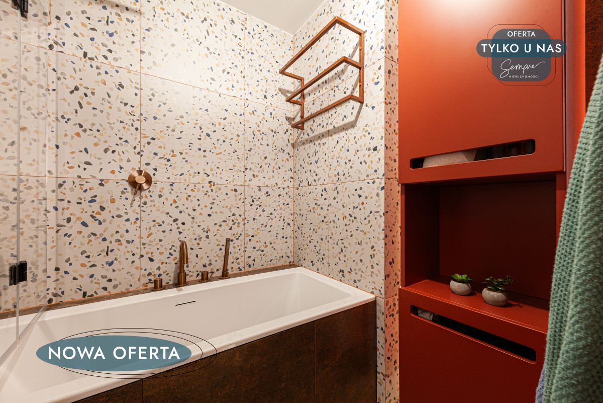 Łazienka i oddzielne WC to układ, który doceni się dopiero w praktyce, zwłaszcza o poranku. Nowoczesne oświetlenie, wanna z prysznicem, w której można naprawdę odpocząć,  funkcjonalne rozwiązania — tutaj po prostu chce się zatrzymać na chwilę dłużej.