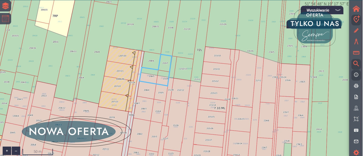 Kształt działek: prostokąty o wymiarach około 20m x 27m (210/7), 24m x 29m (208/5), 20m x 24m (210/6)