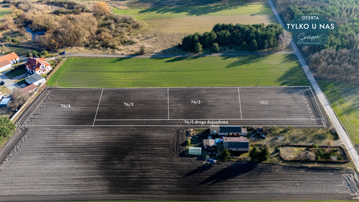 Do działki prowadzi droga dojazdowa o numerze 76/5, zapewniająca wygodny dostęp przez cały rok.