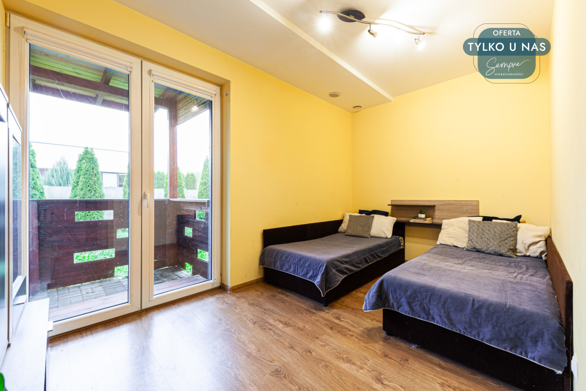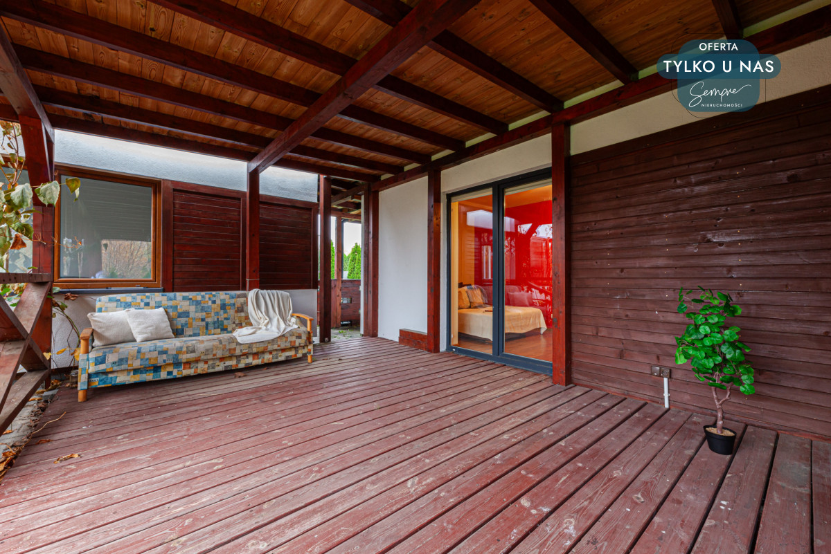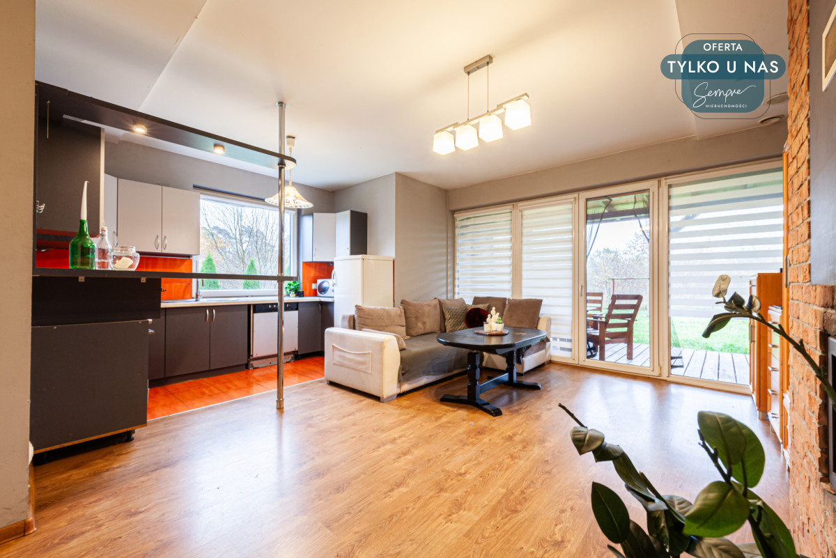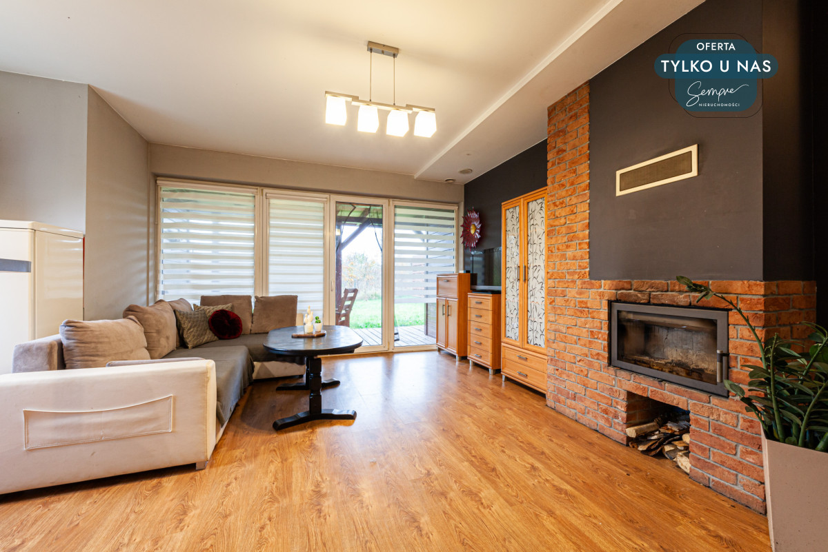 Wnętrze domu wyróżnia się funkcjonalnym układem i przytulnym charakterem. Duże okna tarasowe (PCV w kolorze drewnopodobnym od zewnątrz) zapewniają mnóstwo naturalnego światła, szczególnie w salonie z widokiem na ogród. Na podłogach położono płytki i panele, a dodatkowym atutem jest kominek w salonie, idealny na chłodniejsze wieczory.